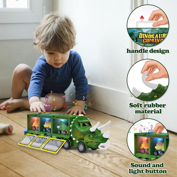 Press the button on the body, you can see the flashing lights, listen to realistic music, dinosaur sounds and car sounds, which is very attractive to children.