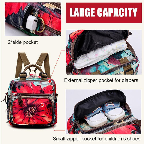 Large capacity designed for mommy. There are multiple layers and pockets for baby bottles, diapers, wipes, clothes, etc.