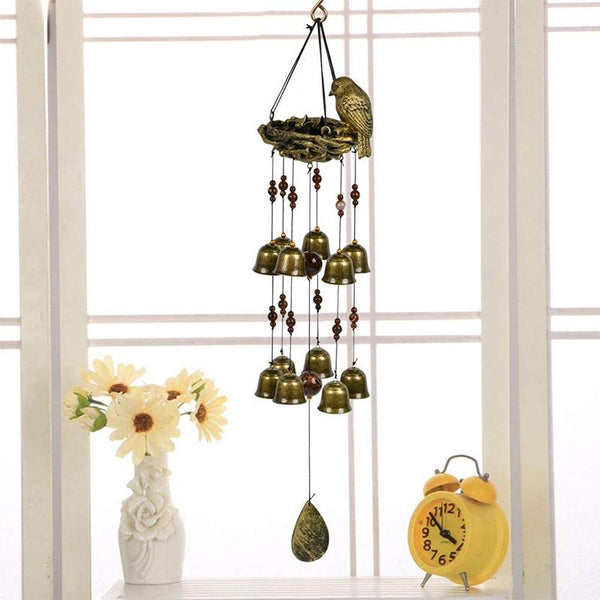 DESIGN DETAILS – Bronze-colored resin bird nest with mother bird and her 2 children waiting for feeding; 12 copper alloy bells and wind catcher. Hangs beautifully in your garden, home, patio or office.
