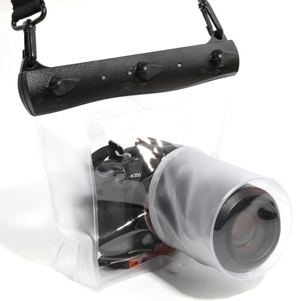 It includes removable polycarbonate / silicone optical lens with filter and accepts a bellows lens system ranging from 2.0'' (5.1 cm) to 6.0'' (15.2 cm)and up to 80mm in Diameter. giving you lots of options for lenses. Takes pictures with zoom control - even when the camera is in the pouch.