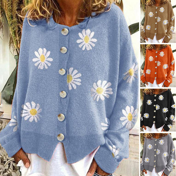 Features: Straight Buttons, Front Placket, V-Neck, Crew Neck, Daisy Floral Print Embroidery, Loose Fit, Long Sleeves, Solid Color