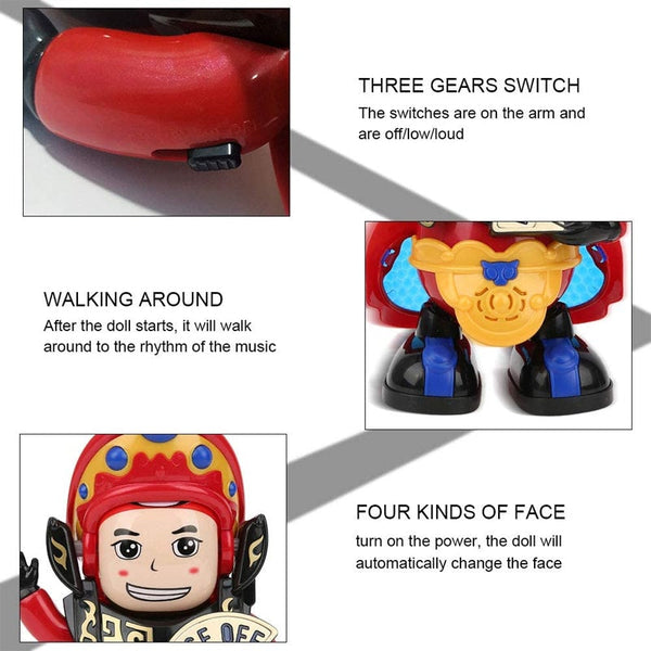 Four kinds of face, turn on the power, the doll will automatically change the face. In the absence of power, press the brim to change face.