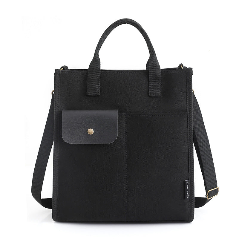 Roomy: Inside: 1 main zip pocket. 1 interior pocket for makeup and other small items; EXTERIOR: This canvas shoulder bag has 3 pockets on the front. Large enough to hold wallet, cell phone, small notebook and water bottle.