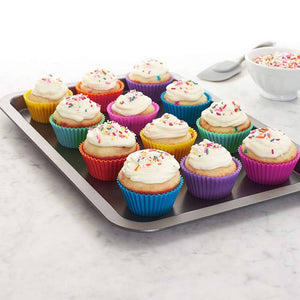 - 12-pack of reusable baking cups; made of food-grade silicone; ideal for baking, lunch/snack cups, and more.